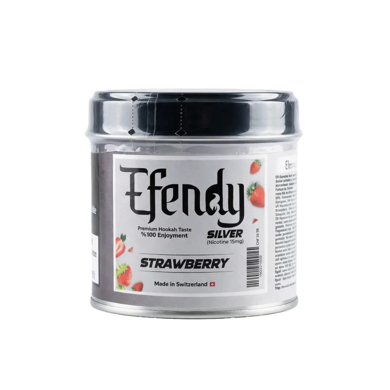 Efendy Silver – Strawberry ist ein hochwertiger Shisha-Tabak. Er sorgt für dichten Rauch und eine starke, gleichmässige Performance. Der feine Schnitt macht das Kopfbauen einfach und schnell. Lockere den Tabak vor der Session sanft von unten, dann verteilt sich die Hitze besser und der Kopf läuft stabil. Die 100g-Dose hält den Shisha-Tabak lange frisch und passt perfekt für regelmässige Shisha-Sessions.